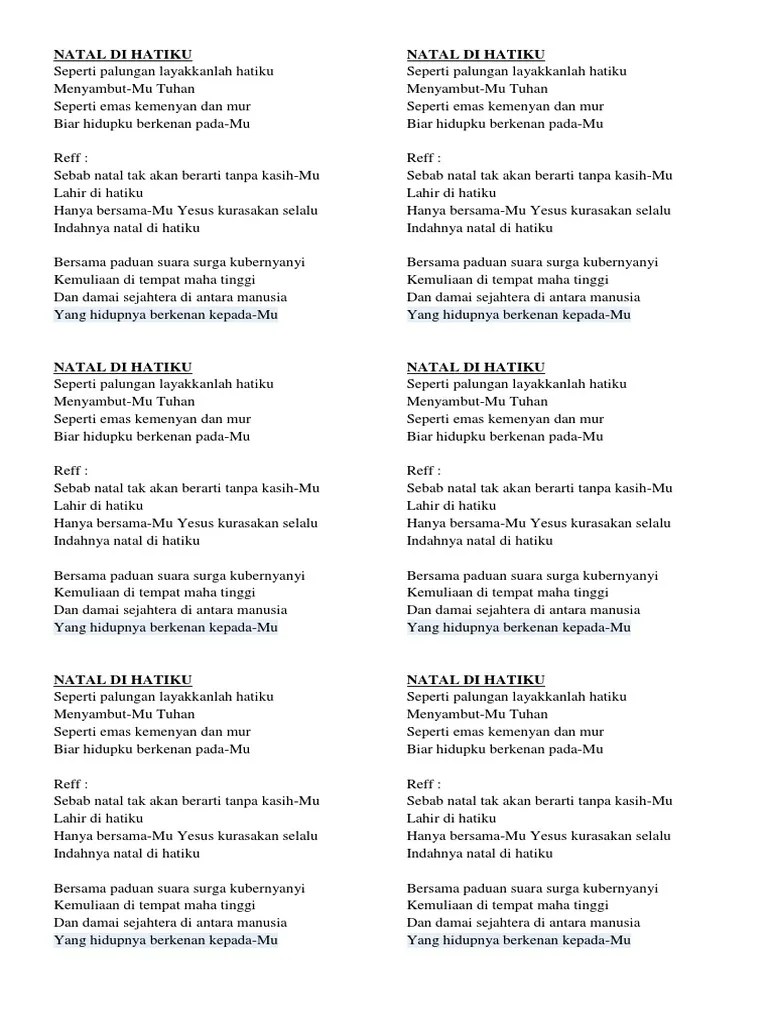 Seperti palungan layakkanlah hatiku menyambutmu tuhan seperti emas, kemenyan dan mur biar hidupku berkenan padamu reff : Seperti emas, kemenyan dan mur,. Syalom, selamat membaca serta menyanyikan lirik lagu rohani natal di hatiku yang dibawakan oleh maria shandi. Pastikan anda sudah melihat video musiknya. Natal di hatiku lirik, teks lagu rohani, song lyrics with youtube video by nikita, jonathan prawira. Sebab natal tak akan berarti tanpa kasih . Dm g c indahnya natal di hatiku Berikut adalah chord gitar lagu natal di hatiku yang dipopulerkan oleh wawan yap feat nikita lengkap dengan liriknya. Lagu berjudul natal di hatiku yang akan saya tulis liriknya berikut merupakan lagu natal yang dipopulerkan oleh nikita natashia, salah satu penyanyi lagu natal . Lirik lagu lengkap natal di hatiku. Sepenggal lirik lagu natal dihatiku berbunyi :seperti palungan layakkanlah hatiku menyambutmu tuhan.